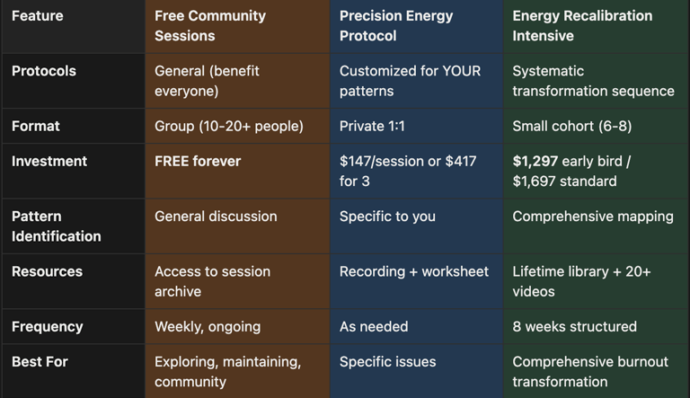 Community sessions are different from personalized work. While the Precision Energy Protocol and Energy Recalibration Intensive target YOUR specific energetic signature, community sessions work with patterns affecting most high-achievers.
