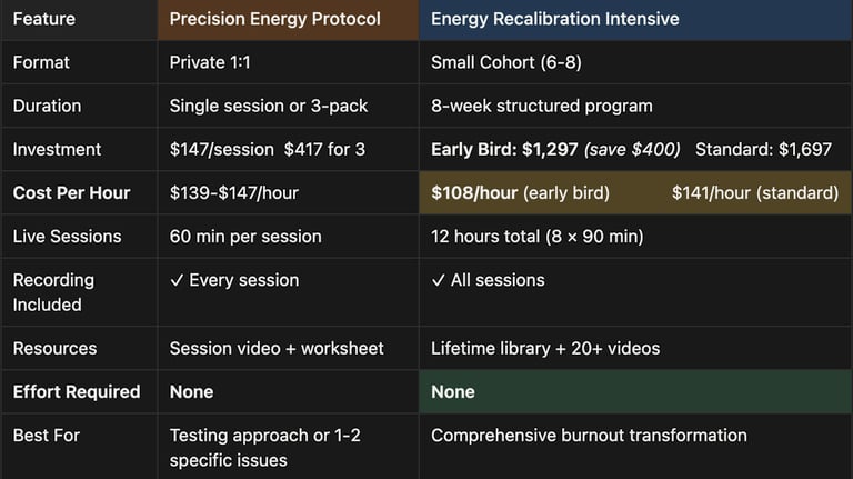 💡 Considering the Intensive? Try a Protocol first—if you join the Energy Recalibration Intensive within 7 days of your session, I'll apply your full $147 toward enrollment, making your early bird investment just $1,150.