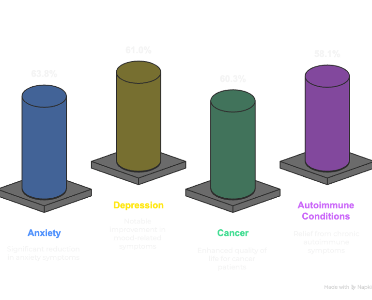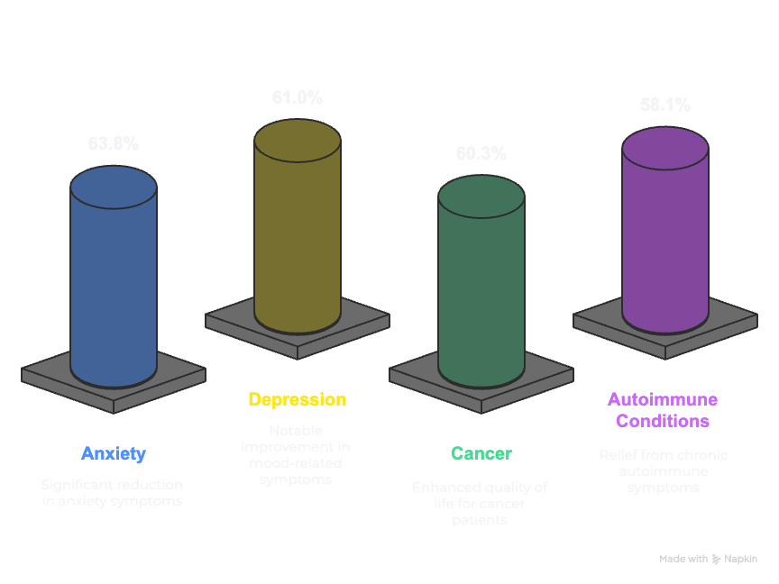 The Validation: Peer-reviewed research shows 64% stress reduction and 61% depression improvement among study participants, with zero reported adverse effects across 265 participants.